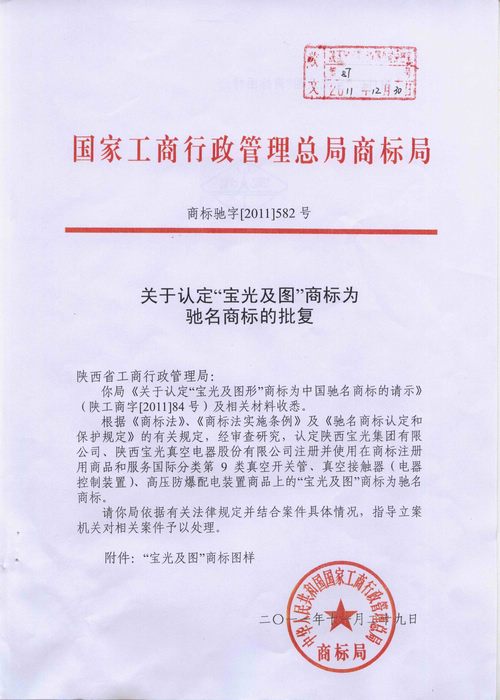 被中華人民共和國(guó)國(guó)家工商行政管理總局商標(biāo)局認(rèn)定為“中國(guó)馳名商標(biāo)”,于2011年11月29日正式下發(fā)了《關(guān)于認(rèn)定“寶光及圖”商標(biāo)為馳名商標(biāo)的批復(fù)》(商標(biāo)馳字【2011】582號(hào))文件)。